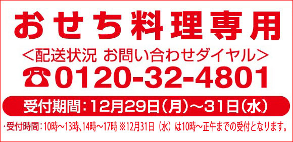 (おせちについては12月30日着とさせていただいております。)●<お届け期間限定>の商品がございます。商品のお届け期間をよくご確認の上、お申込みください。●おせち、クリスマスケーキは配達日時の指定はできません。おせちは12月30日(火)のお届けとなります。※おせち料理は数量に限りがございますので、品切れの際にはご容赦ください。クリスマスケーキは12月20日(土)~12月24日(水)の間のお届けとなります。●クリスマス特集の食品につきましても、ご注文いただきましたらお届け期間に則り、随時お届けいたします。